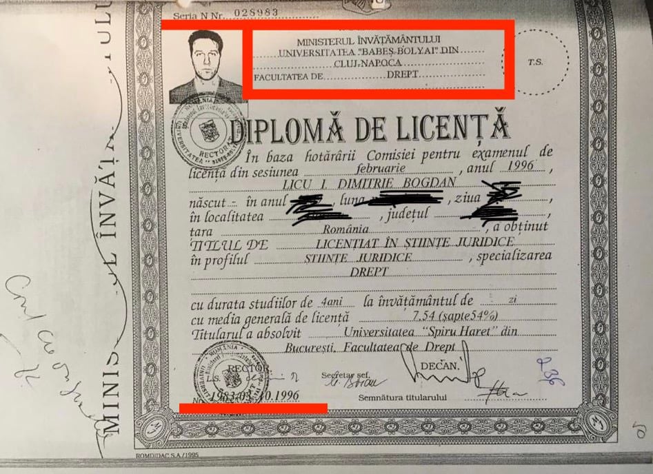 Copia legalizată a diplomei de licență a lui Bogdan Licu de la Universitatea „Babeș Bolyai” din Cluj Napoca, cu aceeași serie, număr și alte date de identificare, a fost prezentată public de jurnalista Emilia Șercan atât în 2020 cât și zilele trecute, documentul fiind obținut din cauza în care aceasta a fost parte și prin care Bogdan Licu a încercat timp de 3 ani să scape de titlul de doctor SRI.