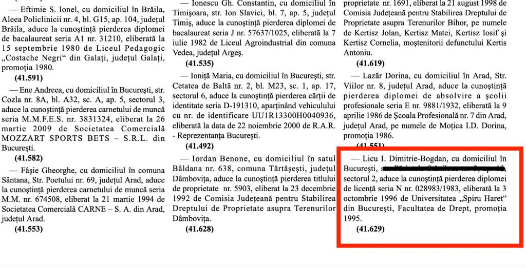 „Licu I. Dimitrie – Bogdan cu domiciliul (…) aduce la cunoștință pierderea diplomei de licență seria N nr.028983/1983, eliberată la 3 octombrie 1996 de Universitatea „Spiru Haret” din București, Facultatea de Drept, promoția 1995”.