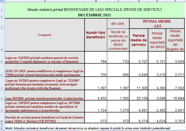 Potrivit CNPP, de Legea nr. 216/2015 privind acordarea pensiei de serviciu membrilor Corpului diplomatic şi consular al României au beneficiat în luna decembrie un număr de 794 persoane. Pensia medie era de 5.727 de lei, din care 3.004 de lei suportaţi de la bugetul de stat.