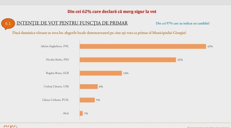 Adrian Anghelescu, primarul municipiului Giurgiu este pe primul loc în opțiunea de vot a giurgiuvenilor. 10 procente diferența pentru Adrian Anghelescu față de următorul competitor.