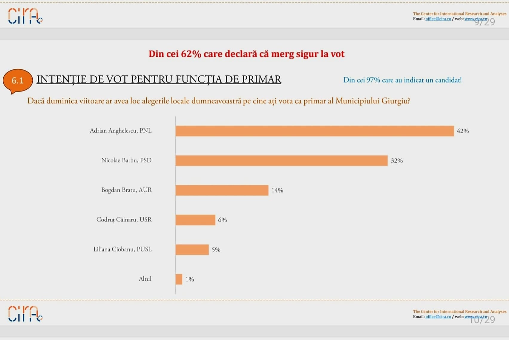 Iată rezultatele celui mai recent sondaj de opinie, care ne obliga să transmitem mulțumirile noastre în primul rând alegătorilor giurgiuveni, apoi să ne mobilizam pentru a securiza și pentru a crește acest rezultat, care se datorează muncii de 3 ani și șase luni a întregii echipe liberale în municipiul Giurgiu, cu sprijinul parlamentarilor și europalamentarului nostru.