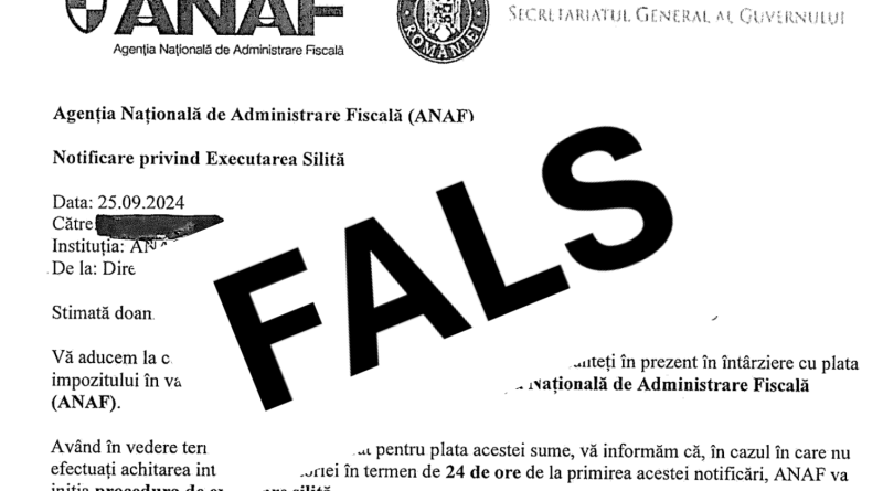 Mesajele sunt transmise, de această dată, de la adresa de e-mail valorificare@anaf.pro. Atragem atenția că această adresă de e-mail NU aparține ANAF și nu trebuie să dați curs solicitărilor!