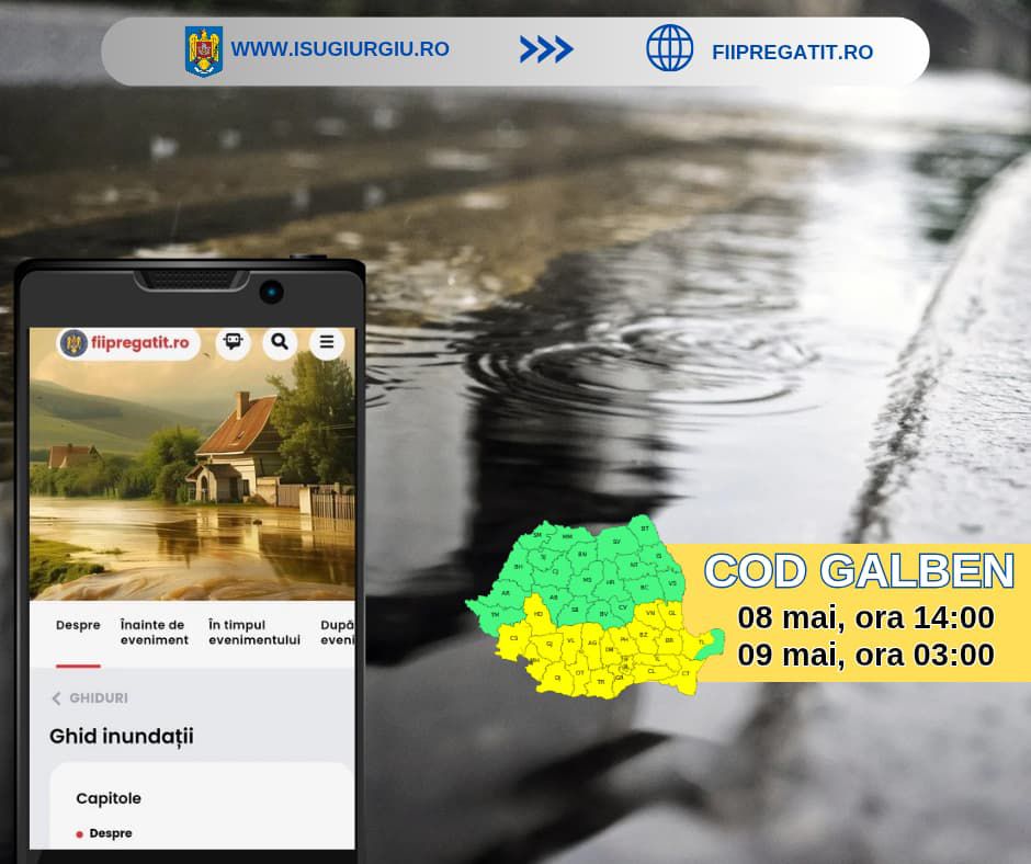 Informații despre modul de comportare în cazul producerii unor situații de urgență sau alte date utile despre manifestarea fenomenelor meteorologice periculoase pot fi obținute prin accesarea portalului fiipregatit.ro sau prin intermediul aplicației DSU, ce poate fi descărcată gratuit din Google Play Store și AppStore. (ISU Giurgiu)