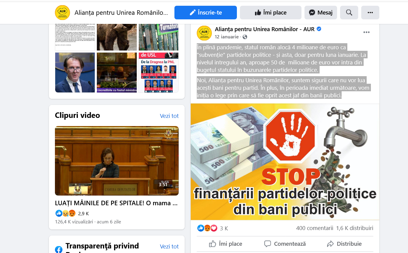 Astfel, în 12 ianuarie gruparea posta: „În plină pandemie, statul român alocă 4 milioane de euro ca “subvenție” partidelor politice – și asta, doar pentru luna ianuarie. La nivelul întregului an, aproape 50 de milioane de euro vor intra din bugetul statului în buzunarele partidelor politice. Noi, Alianța pentru Unirea Românilor, suntem sigurii care nu vor lua acești bani pentru partid. În plus, în perioada imediat următoare, vom iniția o lege prin care să fie oprit acest jaf din banii publici”.