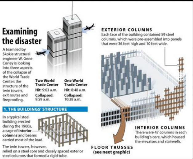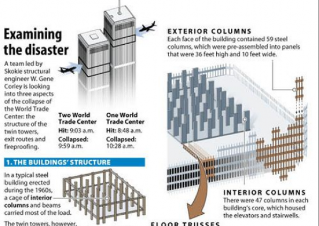 Reţeaua de grinzi ce susţinea etajele nu era deloc deloc solidă, ceea ce a dus la destabilizarea lor rapidă, spune el. În plus, pentru că avioanele au lovit în unghi, flăcările au cuprins mai multe etaje simultan care au început să cadă peste celelalte.