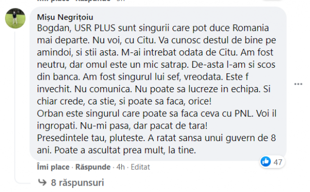 „Bogdan, USR PLUS sunt singurii care pot duce Romania mai departe. Nu voi, cu Citu. Va cunosc destul de bine pe amindoi, si stii asta. M-ai intrebat odata de Citu. Am fost neutru, dar omul este un mic satrap. De-asta l-am si scos din banca. Este f invechit. Nu stie sa lucreze in echipa. Si chiar crede, ca poate sa faca orice! Orban este singurul care poate sa duca PNL mai departe. Voi il ingropati. Nu-mi pasa, dar pacat de tara! Presedintele tau, pluteste. A ratat sansa unui guvern de 8 ani. Poate a ascultat prea mult, la tine”, se arată în comentariul ce pare a fi asociat contului lui Mişu Negriţoiu.
