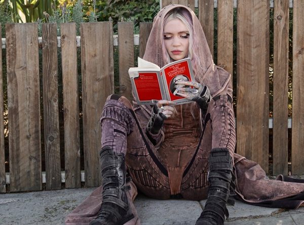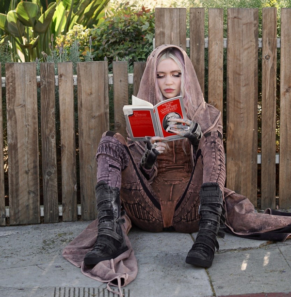 Grimes, Claire Boucher pe numele ei real, a fost surprinsă îmbrăcată într-un costum fantasy în timp ce răsfoia cartea anticapitalistă.