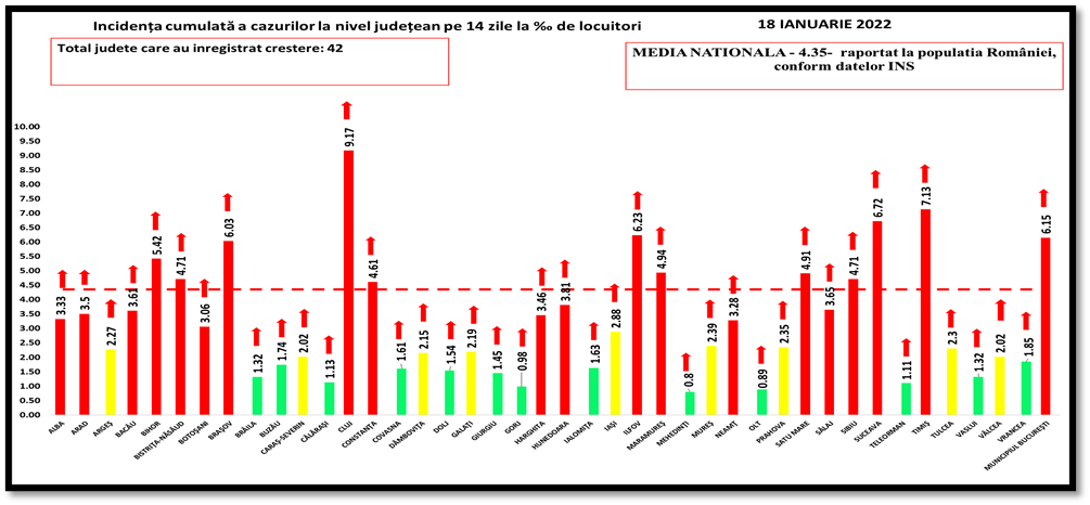 Coeficientul infectărilor cumulate la 14 zile, raportate la 1.000 de locuitori este calculat de către Direcţiile de Sănătate Publică, la nivelul Municipiului Bucureşti şi al judeţelor. Mai jos aveţi graficul realizat în baza raportărilor primite de CNCCI de la Direcţiile de Sănătate Publică: