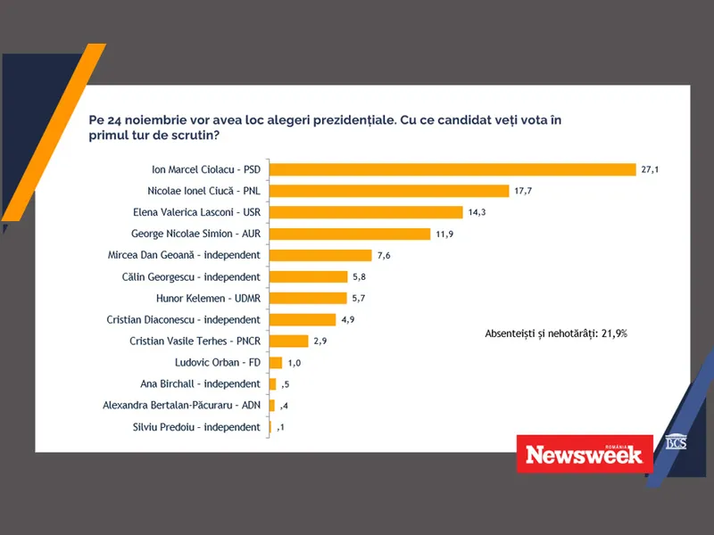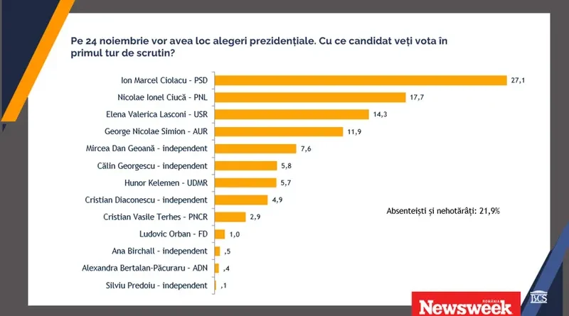 Un ultim sondaj de opinie, realizat la comanda Newsweek, arată că Marcel Ciolacu va câștiga primul tur al alegerilor prezidențiale care au loc pe 4 noiembrie. Pe poziția a doua este Nicola Ciucă, liderul PNL.