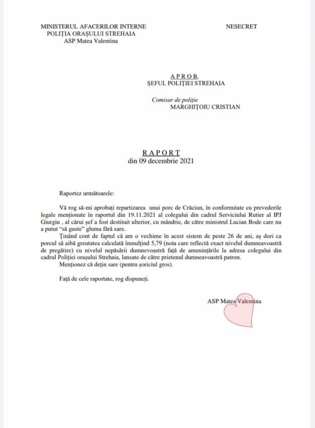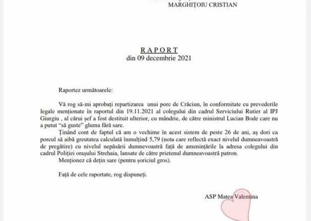 PS: …să nu uit: sunt de la Garda de Coastă (să se stie unde se va dispune cercetarea), dar peste noapte m-am mutat cu gândul la Strehaia să pot cere porcul… la Constanţa încă nu se dau ?”, a scris poliţista Valentina Matea pe pagina sa de socializare unde a şi postat un „raport” către superiori: