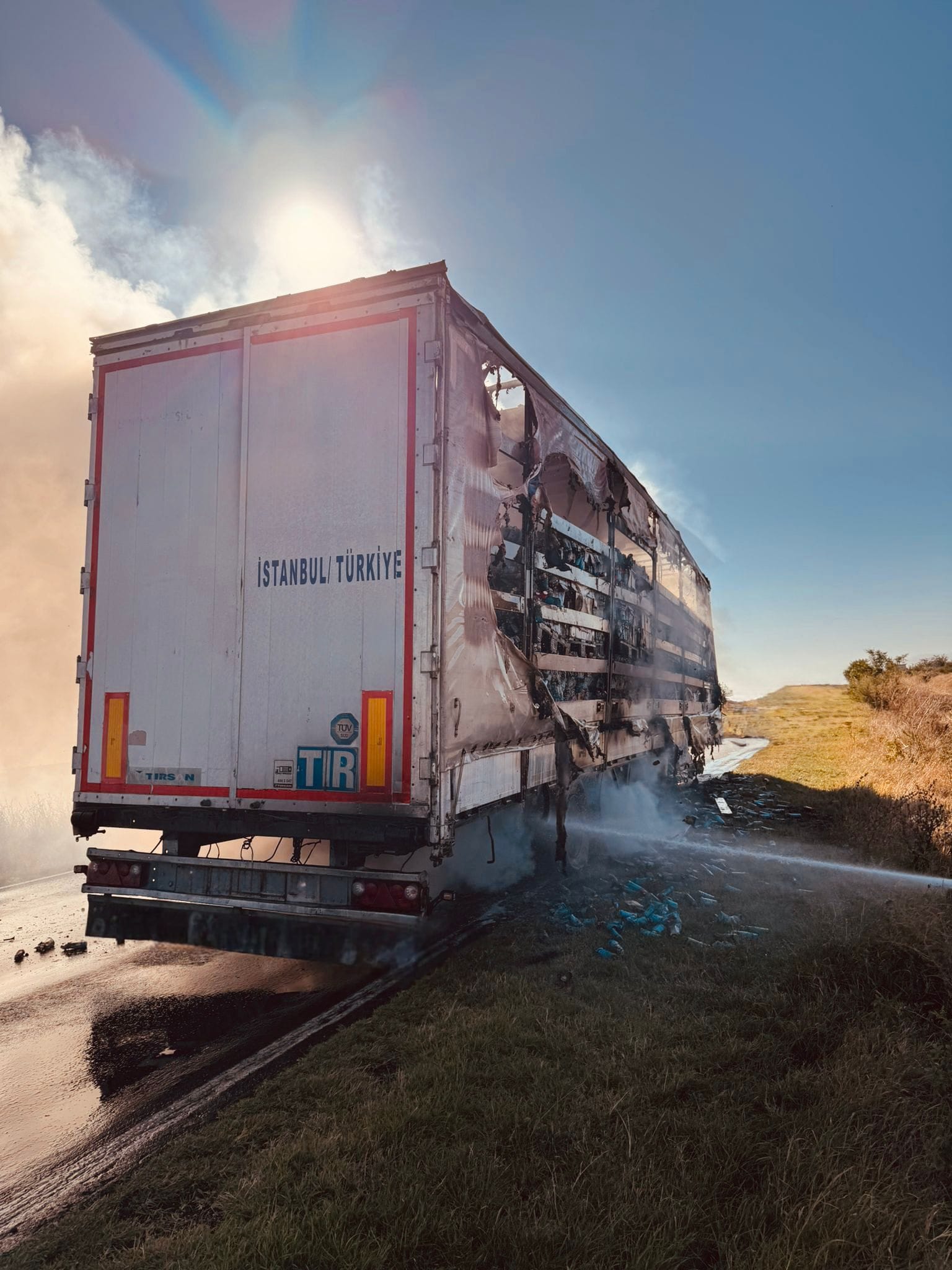 Pompierii au constatat faptul că remorca era încărcată cu produse de îngrijire personală (apă de gură) și ardea în proporție de aproximativ 70%.