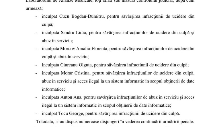 • Morar Cristina, pentru săvârşirea infracţiunilor de ucidere din culpă, abuz în serviciu şi acces ilegal la un sistem informatic în scopul obţinerii de date informatice;