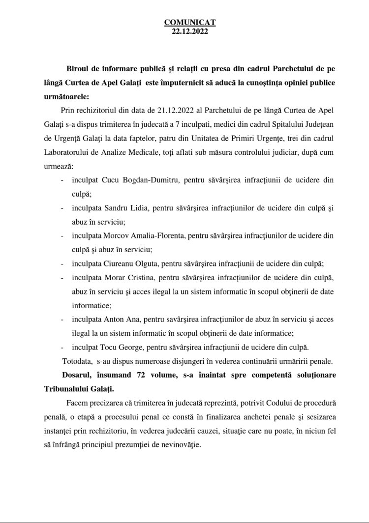 Patru medici de la Uniutatea de Primiri Urgențe a Spitalului Județean Galați și trei de la un laborator de analize au fost trimiși în judecată pentru infracțiuni de ucidere din culpă și abuz în serviciu deoarece nu ar fi acordat îngrijiri de specialitate unui pacient a cărui stare de sănătate era gravă sau ar fi întârziat realizarea testelor COVID ale acestuia, potrivit unui comunicat de presă.