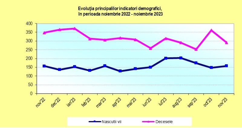 Sporul natural a fost negativ în luna noiembrie 2023 (- 134 persoane), ca urmare a numărului mai mare de decese faţă de naşteri.