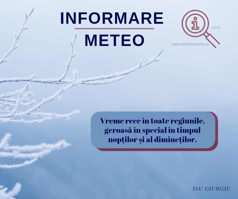 Meteorologii au emis o informare de ger valabilă în județul Giurgiu de astăzi până joi, la ora 10:00. Vremea va fi rece în toată țara, geroasă în special în timpul nopților și al dimineților.